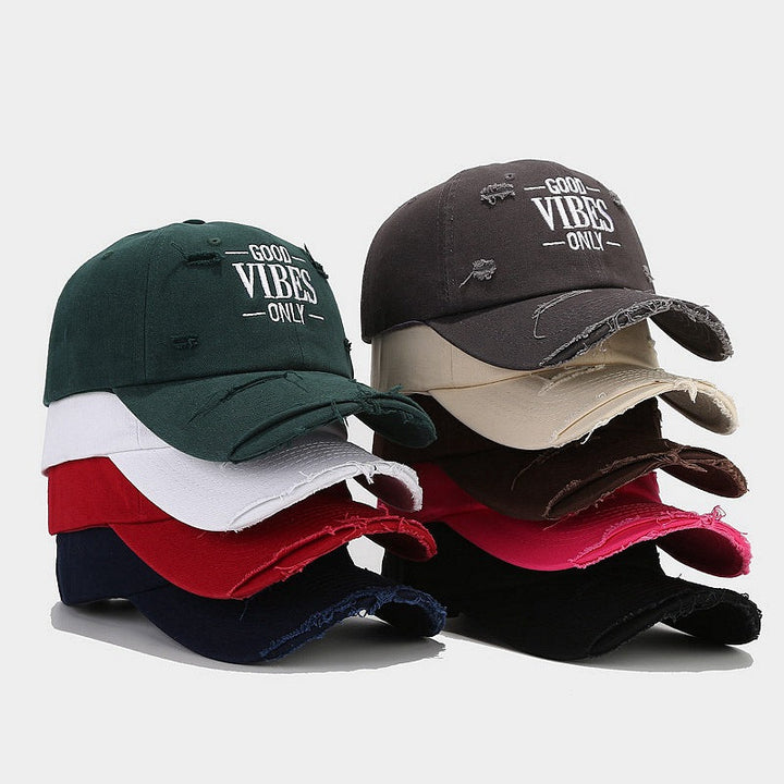 Top off your look with a touch of positivity! Our Good Vibes Only distressed cap is perfect for those who embrace life with enthusiasm and a smile. Made from soft, breathable cotton, this cap doesn't just look good—it feels great too!