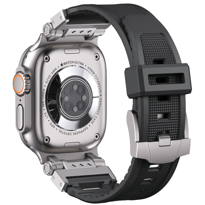 Refine your look with this Apple Watch Band, crafted with reinforced mecha lugs and finished with a precision-cut silicone strap for a rugged and robust look. Once it's on, you'll love it so much that you won't want to take it off.