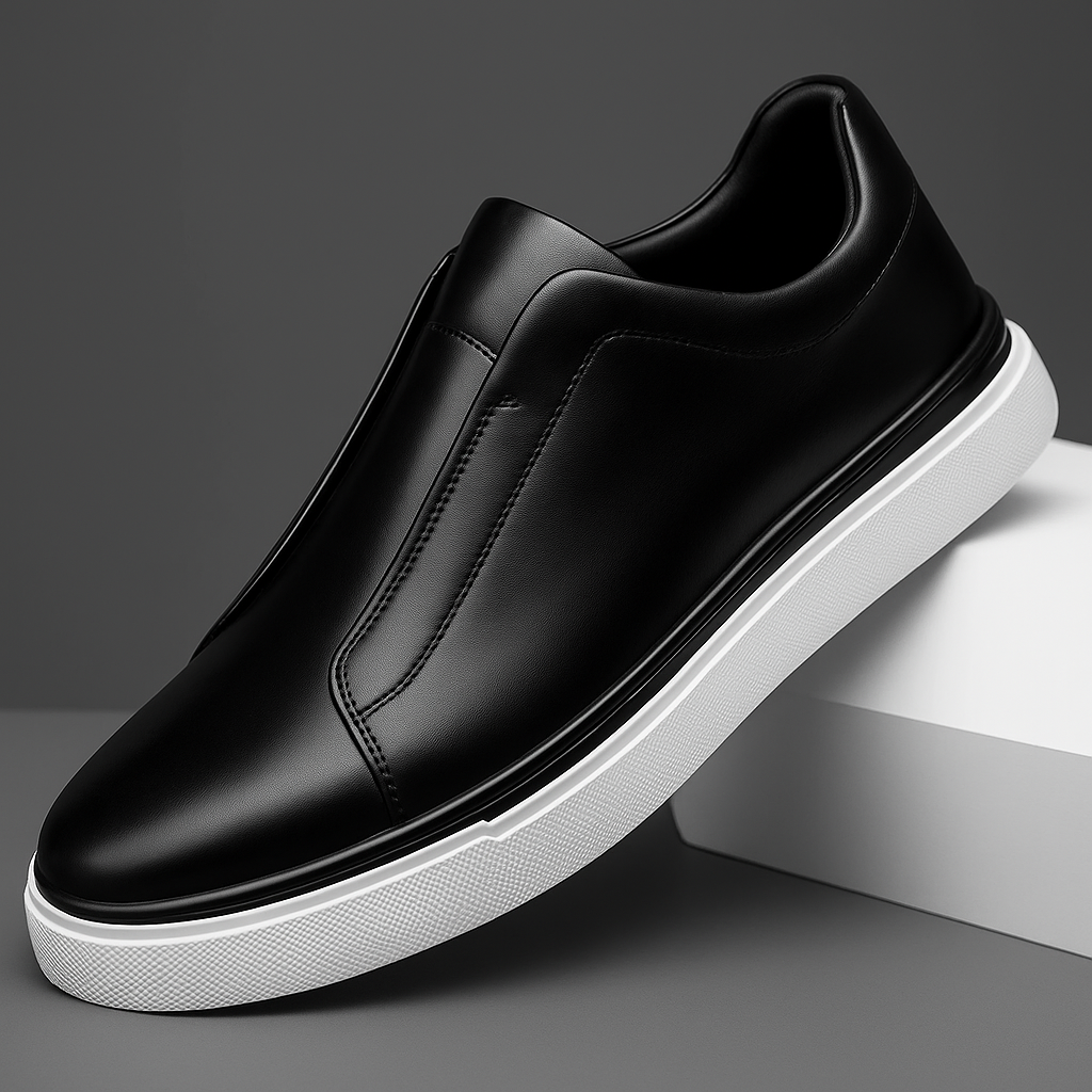 A modern take on a classic sneaker features a smooth, premium leather upper with subtle stitching details and signature no-lace design for a refined look.